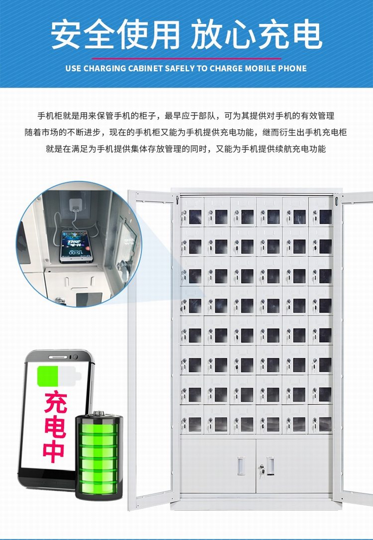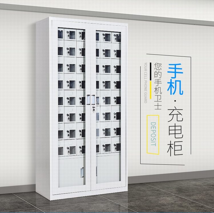 手機保密柜正面為對開金屬邊框玻璃大門,便于觀察柜內情況,堅固透亮,美觀大方。